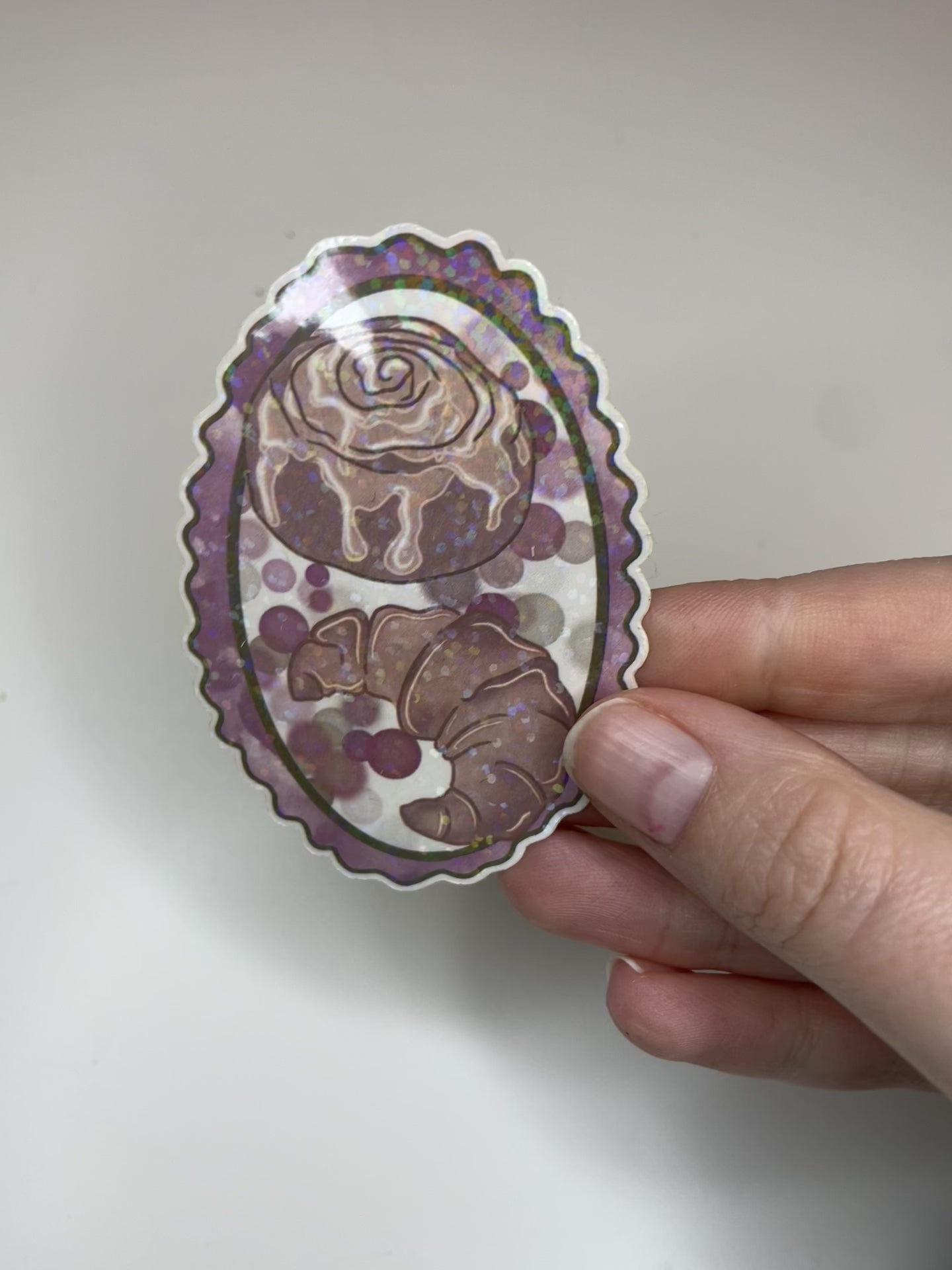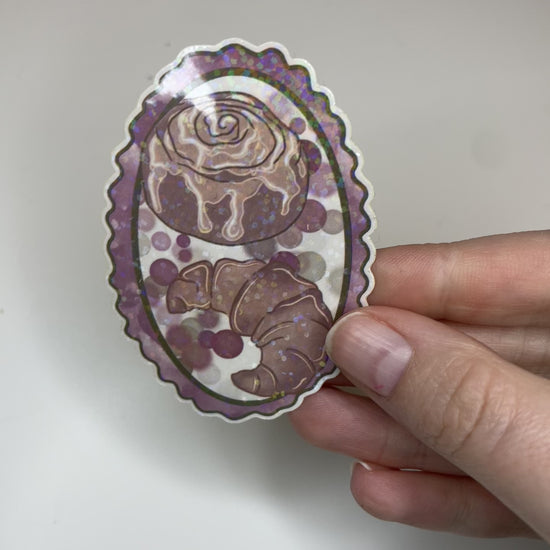 Indulge your sweet tooth and your love for all things sparkly with our Sparkle & Sweets holographic sticker! Featuring a hand-drawn cinnamon roll and a flaky croissant, this sticker is nestled in a scalloped purple frame that radiates a magical, multi-color shimmer whenever it catches the light.