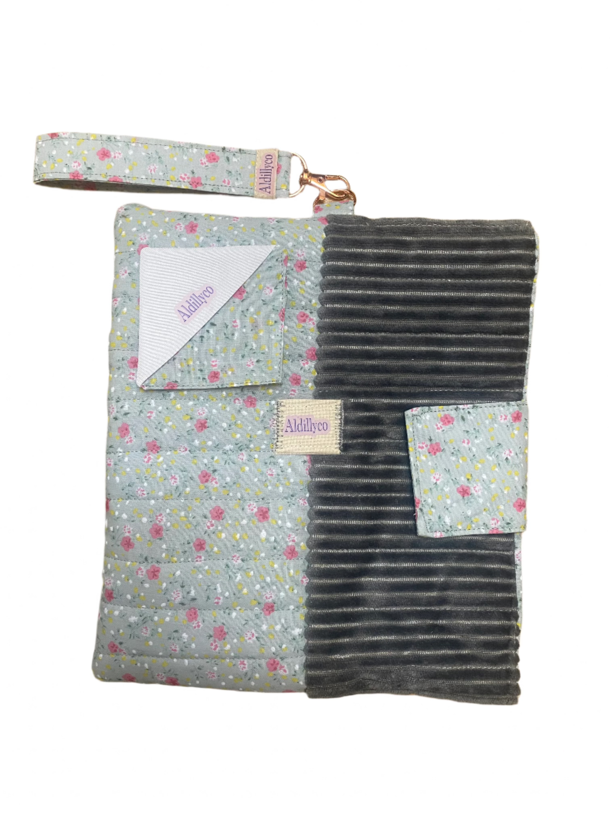 This super sweet cover features a charming split design, blending a delicate blue floral print on one side with a soft and comforting grey corduroy on the other. It's like giving your book a little hug! The clever padding ensures your pages stay perfect, no matter where your day takes you. It fastens securely with a handy press stud, keeping your literary friend tucked away. Plus, with a detachable strap, you can easily carry your book in style – perfect for whimsical walks or cozy cafe visits.