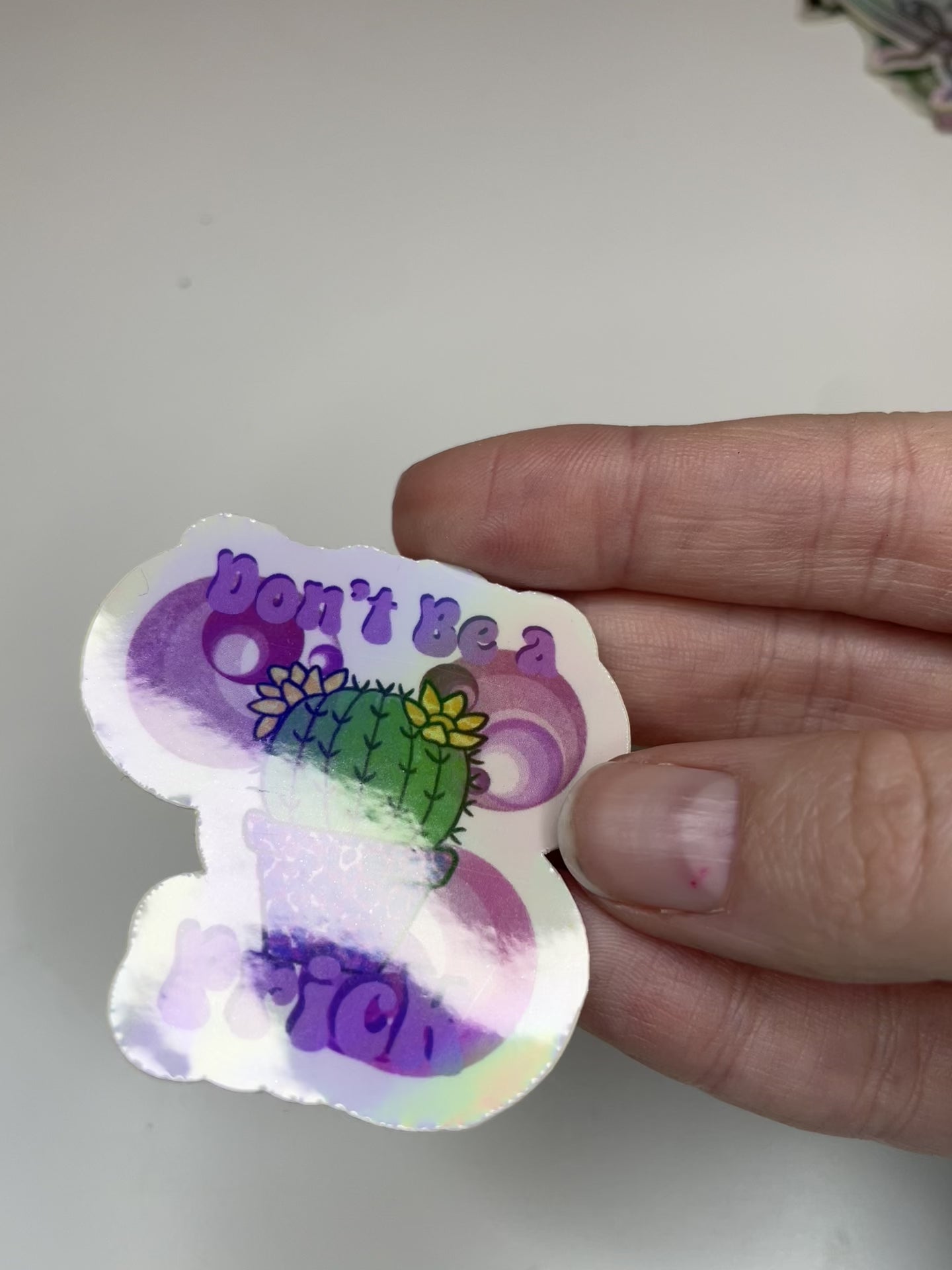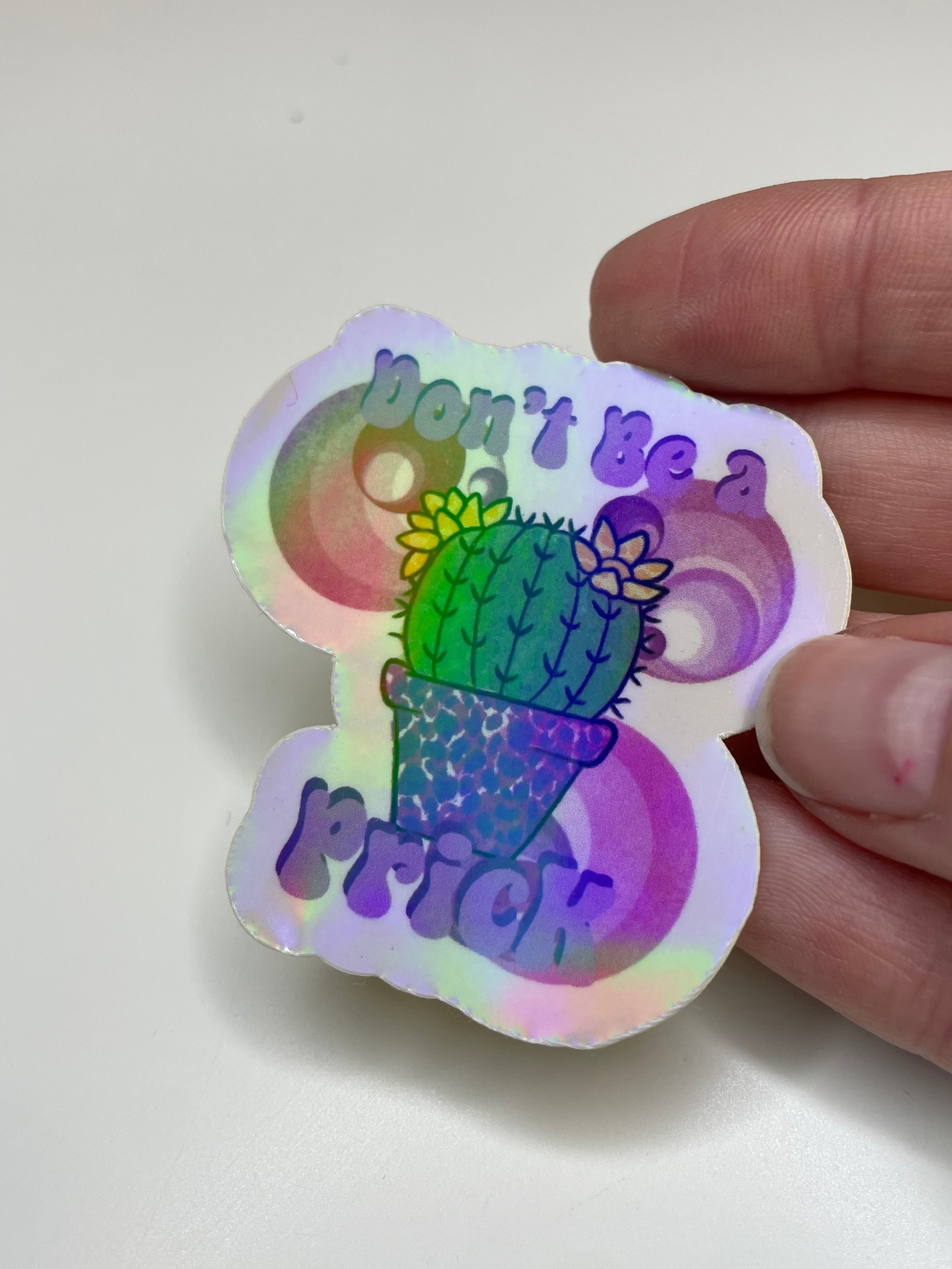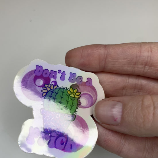 Add a little "spiky" attitude to your collection with our Don’t Be a Prick sticker! This sassy little cactus is more than just a plant; it’s a whole mood. Featuring a flowering cactus in a trendy leopard-print pot, this design is framed by groovy, retro swirls and a holographic finish that shifts and shines with every move.