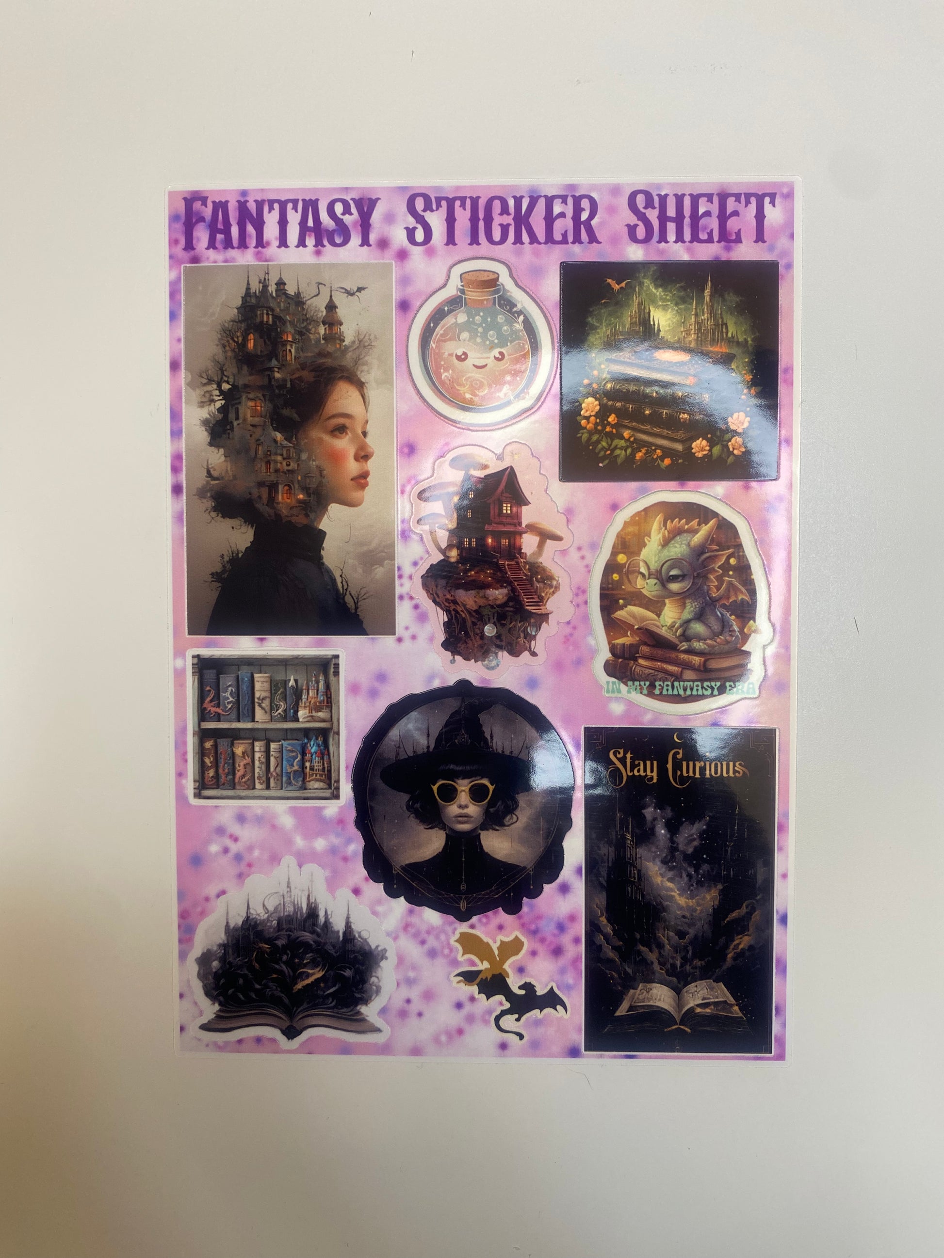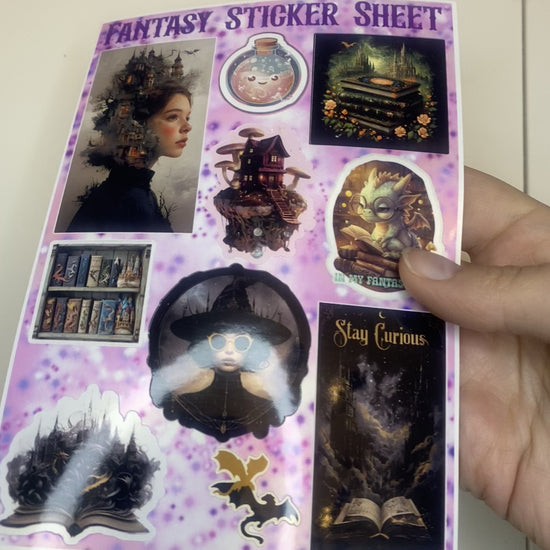 This sheet features 10 unique stickers ready to help you tell your story. You'll find a mysterious fantasy mind woman, our Fantasy Shroom House and a little potion bottle filled with sparkling magic. There's also a sticker that's a nod to your reading journey: "Stay Curious," a perfect motto for any fantasy lover.