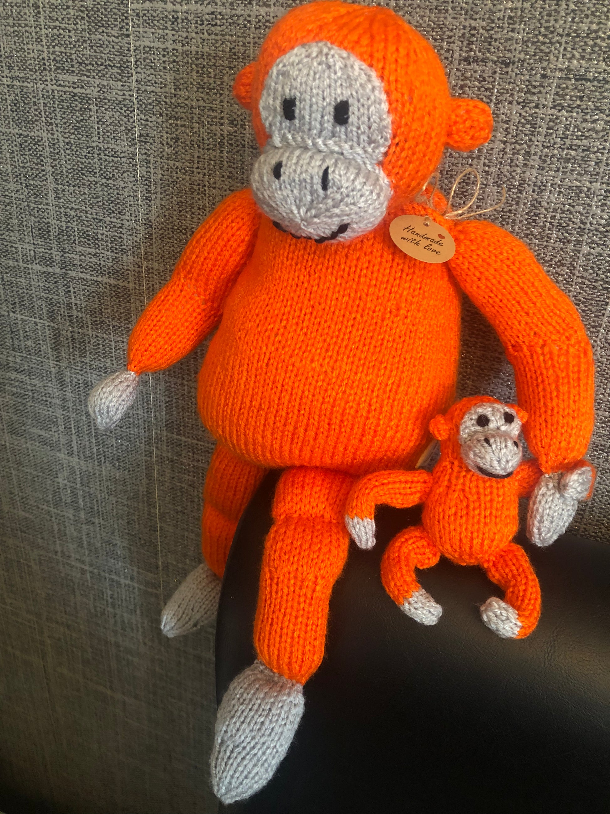 Made with 100% Acrylic yarn and stuffed with Non-allergenic hollow fibre the baby orangoutangs arms do pipe cleaner wires inside to create the grip.