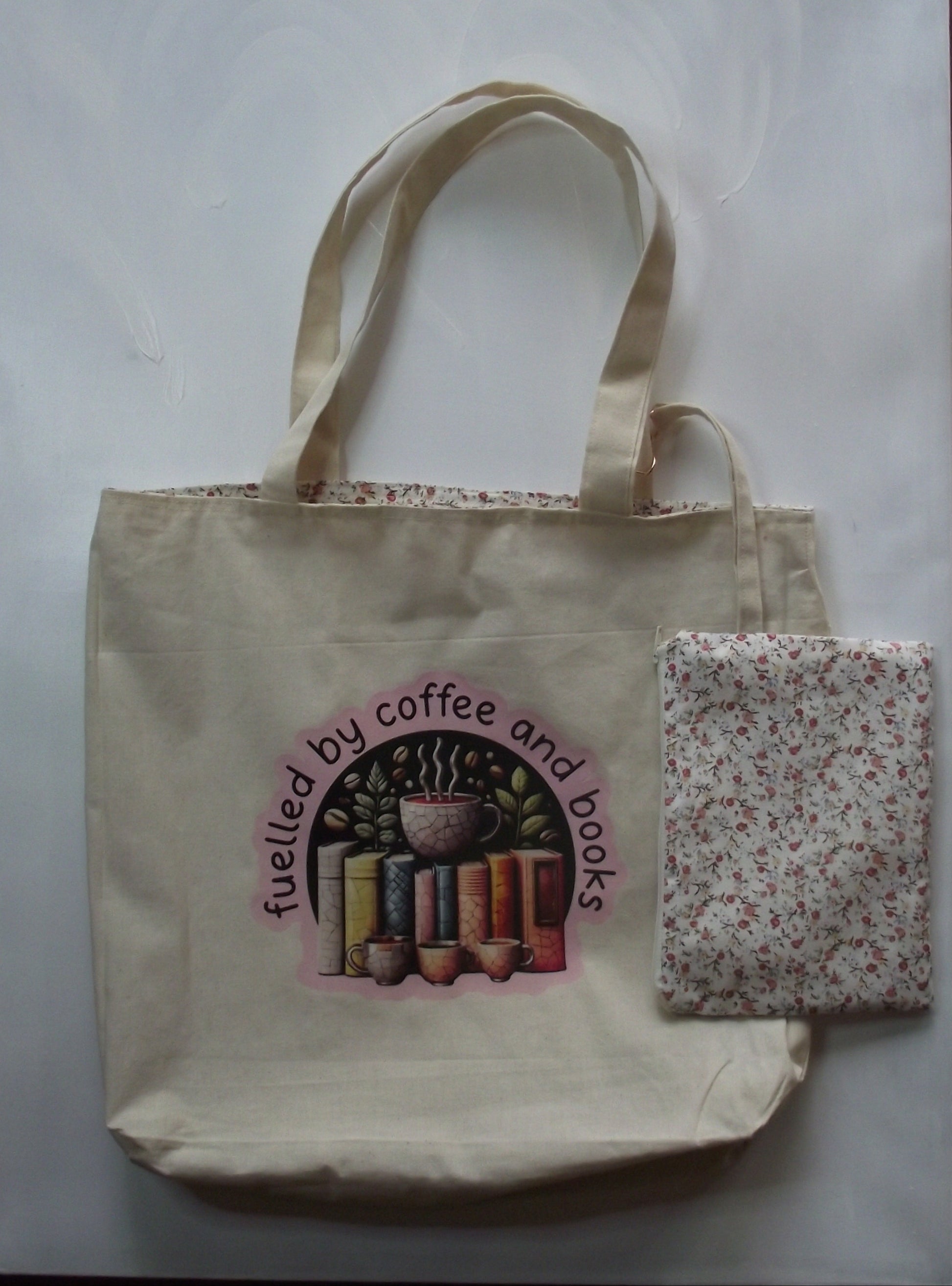 This charming tote proudly declares your passions with a delightful transfer featuring the words 'fuelled by coffee and books' alongside an oh-so-relatable image of a steaming cup and a neat stack of beloved reads. It's a visual high-five to your favourite things!