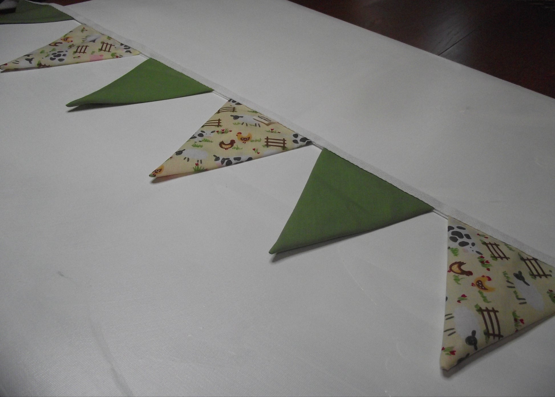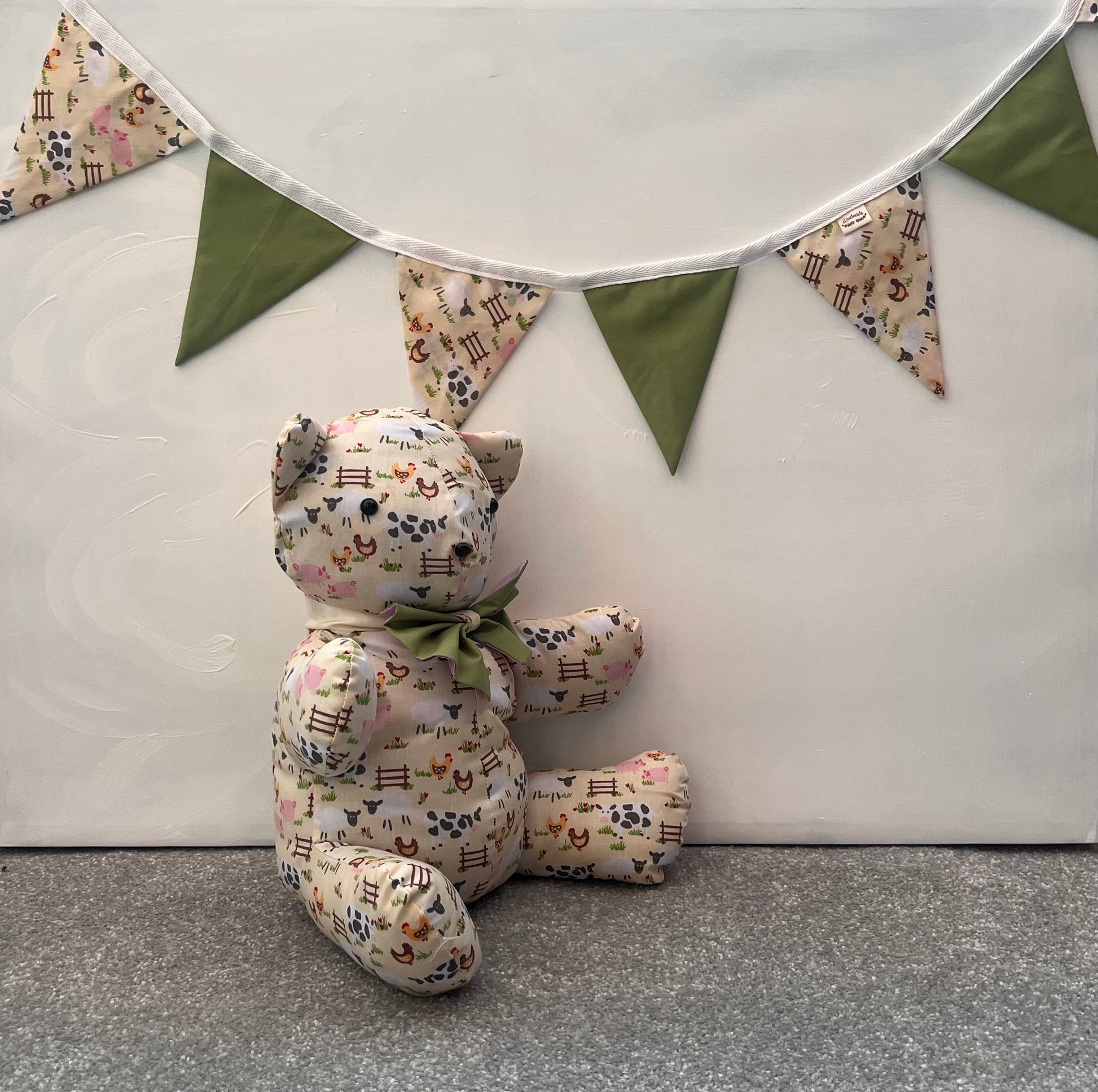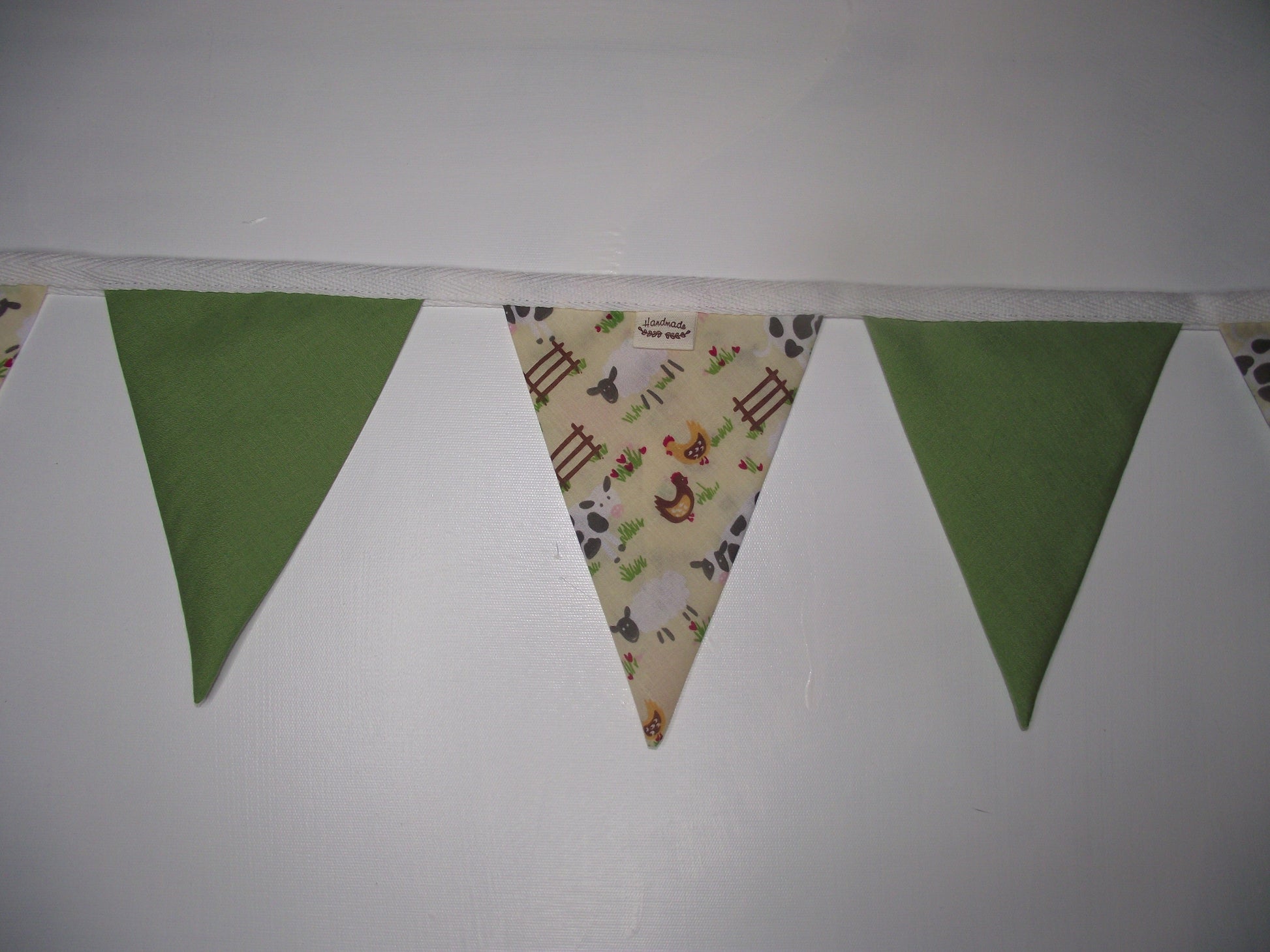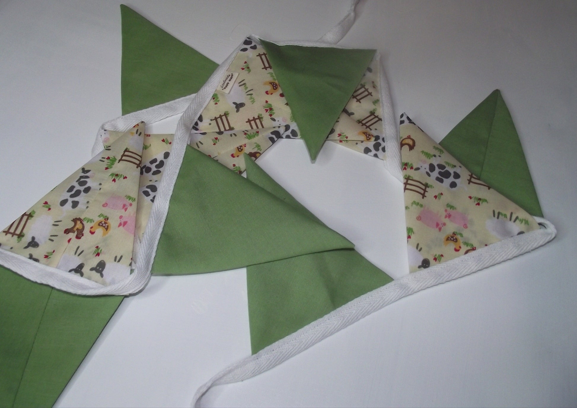 Add a dash of farmyard fun to your nursery with our adorable bunting! Each flag is lovingly handmade, featuring a charming mix of solid green and a delightful farmyard print with the cutest cows, sheep, and pigs you've ever seen.