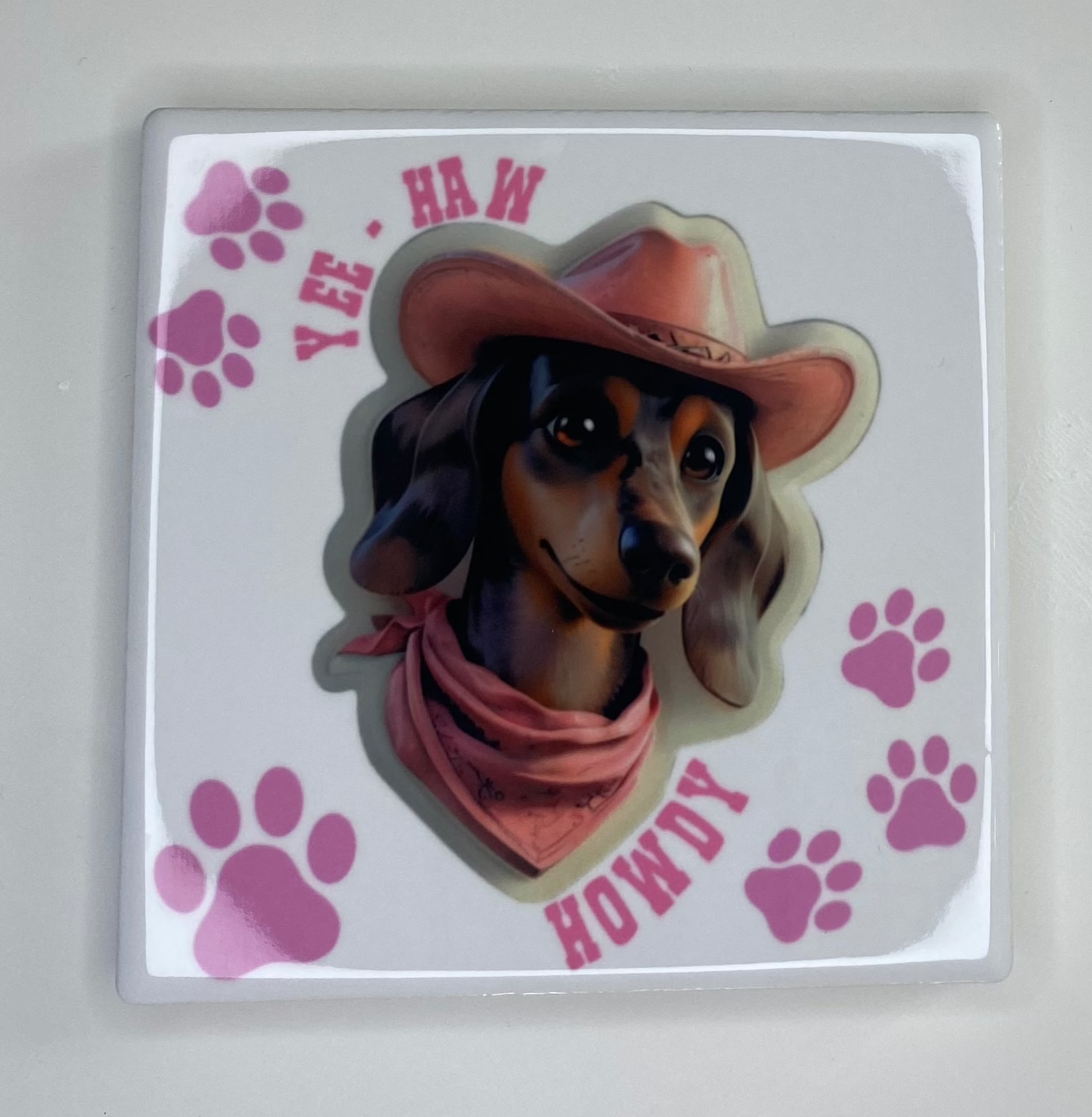Featuring our beloved dachshund, all spruced up in his pink cowboy hat and scarf, this coaster is the most stylish thing on four paws.