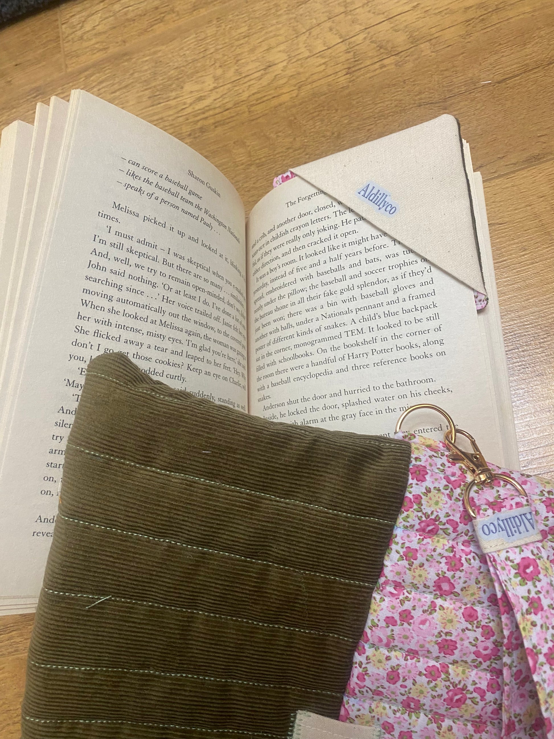 This unique book cover features a charming split design, combining a delicate pink floral print on one half with a soft, tactile green corduroy on the other. No more dog-eared pages or scuffed covers – the padding ensures your books stay pristine while you're on the go. It's super practical too, with a secure press stud fastening to keep your book snugly inside. Plus, the detachable strap makes it easy to carry your literary companion wherever your day takes you.