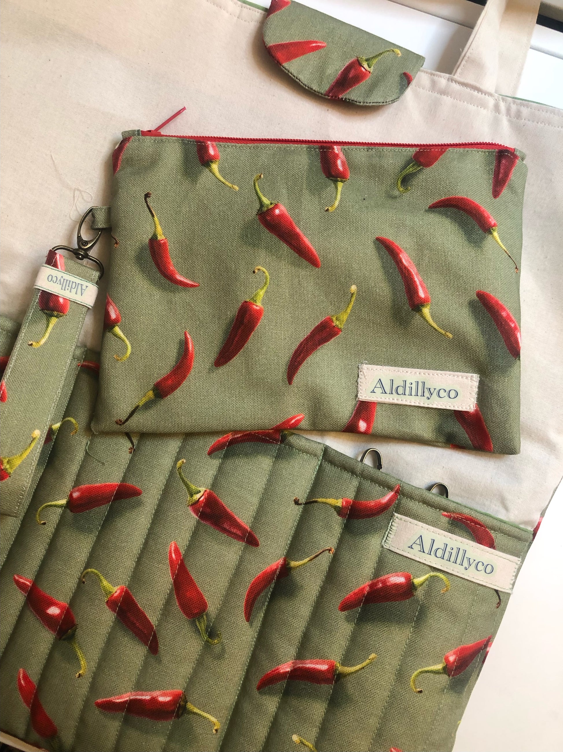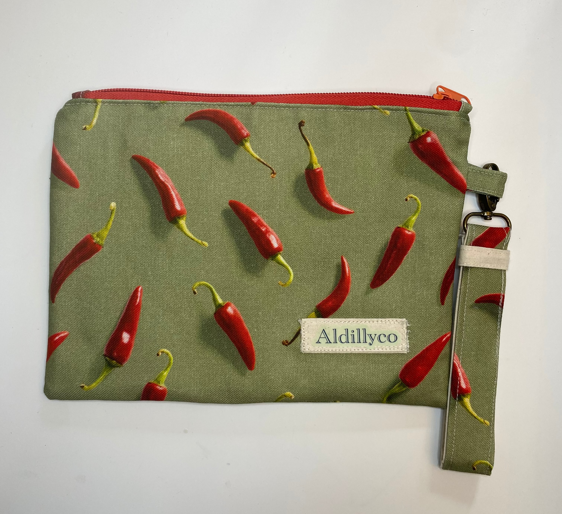 Stay organized in style with the Spicy Essentials Pouch! This fun and fiery pouch is adorned with a vibrant red chilli pepper print on a light green background.